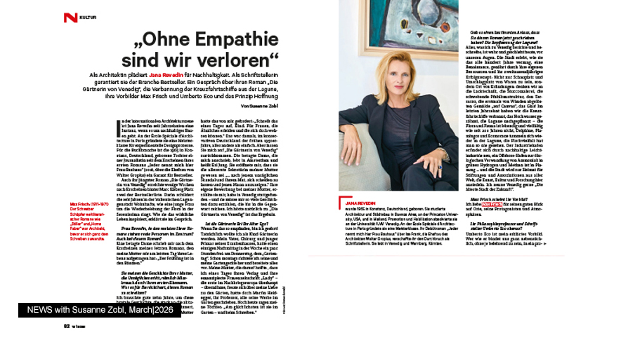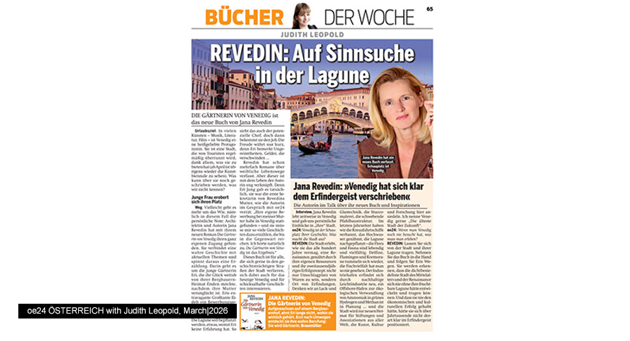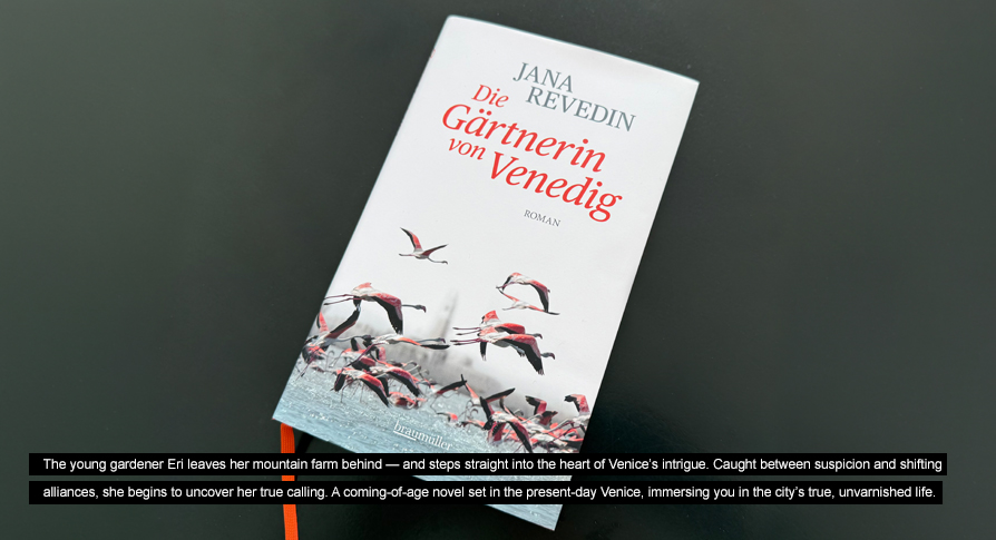 Jana Revedin presents her new novel „Die Gärtnerin von Venedig“ - The Gardener of Venice - (Braumüller), currently #1 on the Austrian bestseller list. Join her on tour: April 23 – Bregenz (Brunner) | May 7 – Baden, Vienna (Salon Christine Dessovic) | May 11 - Vienna (Analog) | May 21 – Sankt Veit (Besold) | May 22 – Kloster Millstatt (Mediathek Radenthein) | June 17 – Munich (Buchpalast) | July 11 – Sankt Urban (Schloss Bach) | July 16 - Pörtschach (Seehotel Jo) | July 18 – Pörtschach on Lake Wörth (Art Lounge)